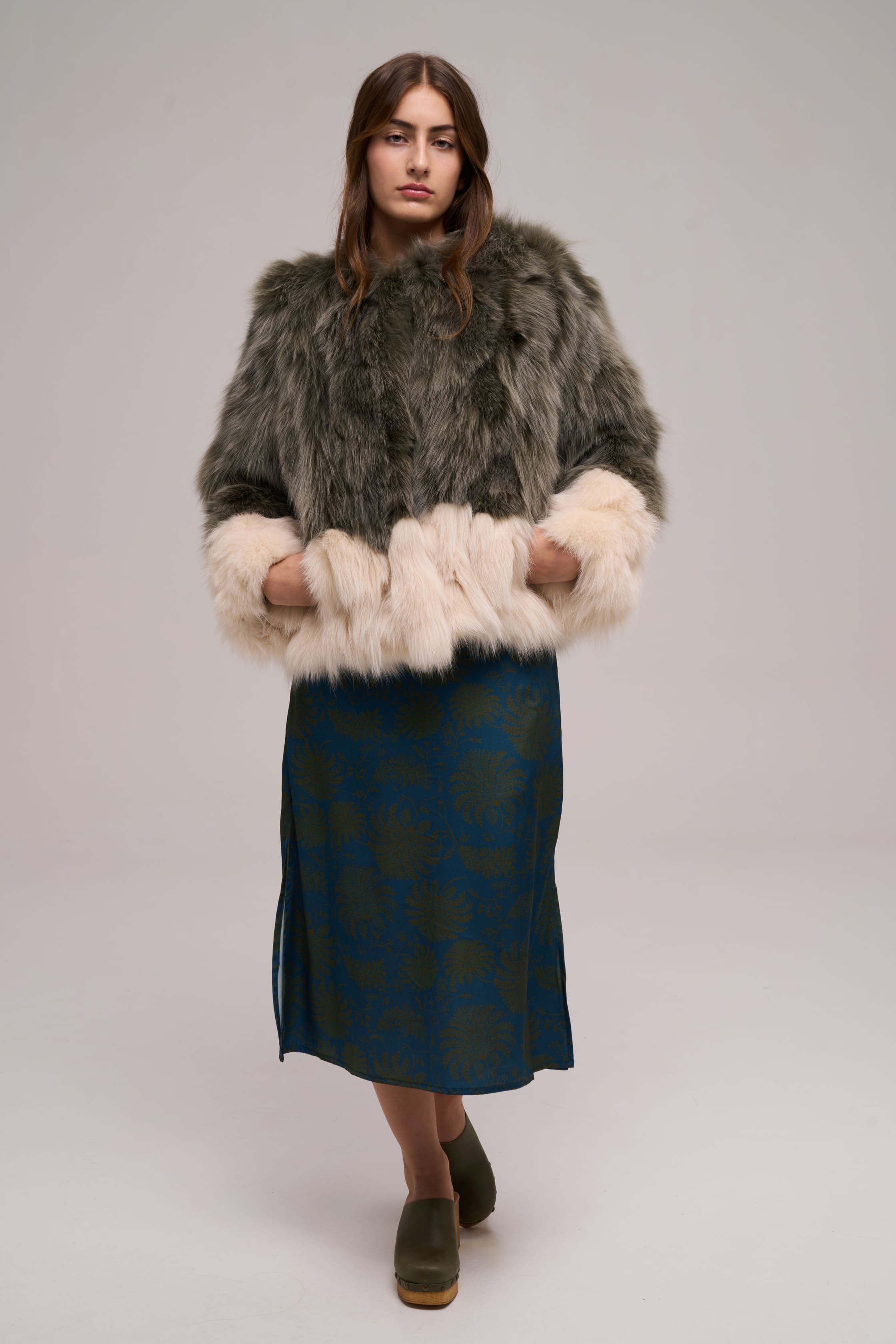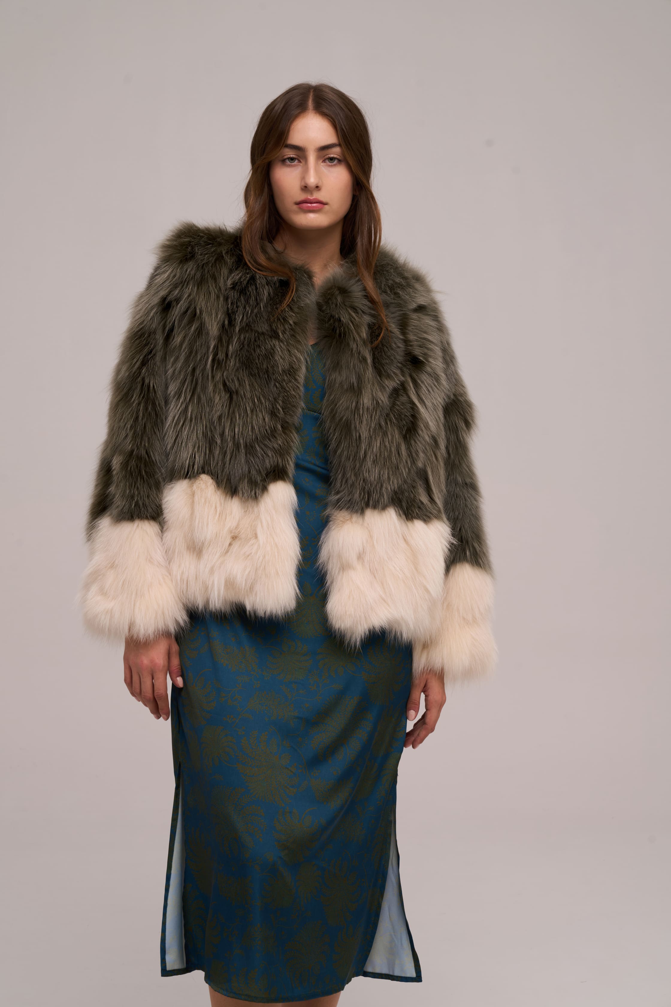 Chaqueta de Zorro Bicolor Ramiro Guardiola, pieza artesanal que combina dos tonos naturales de zorro para crear un contraste elegante y moderno. Su textura suave y su acabado ligero la convierten en una prenda ideal para destacar con estilo y sofisticación.