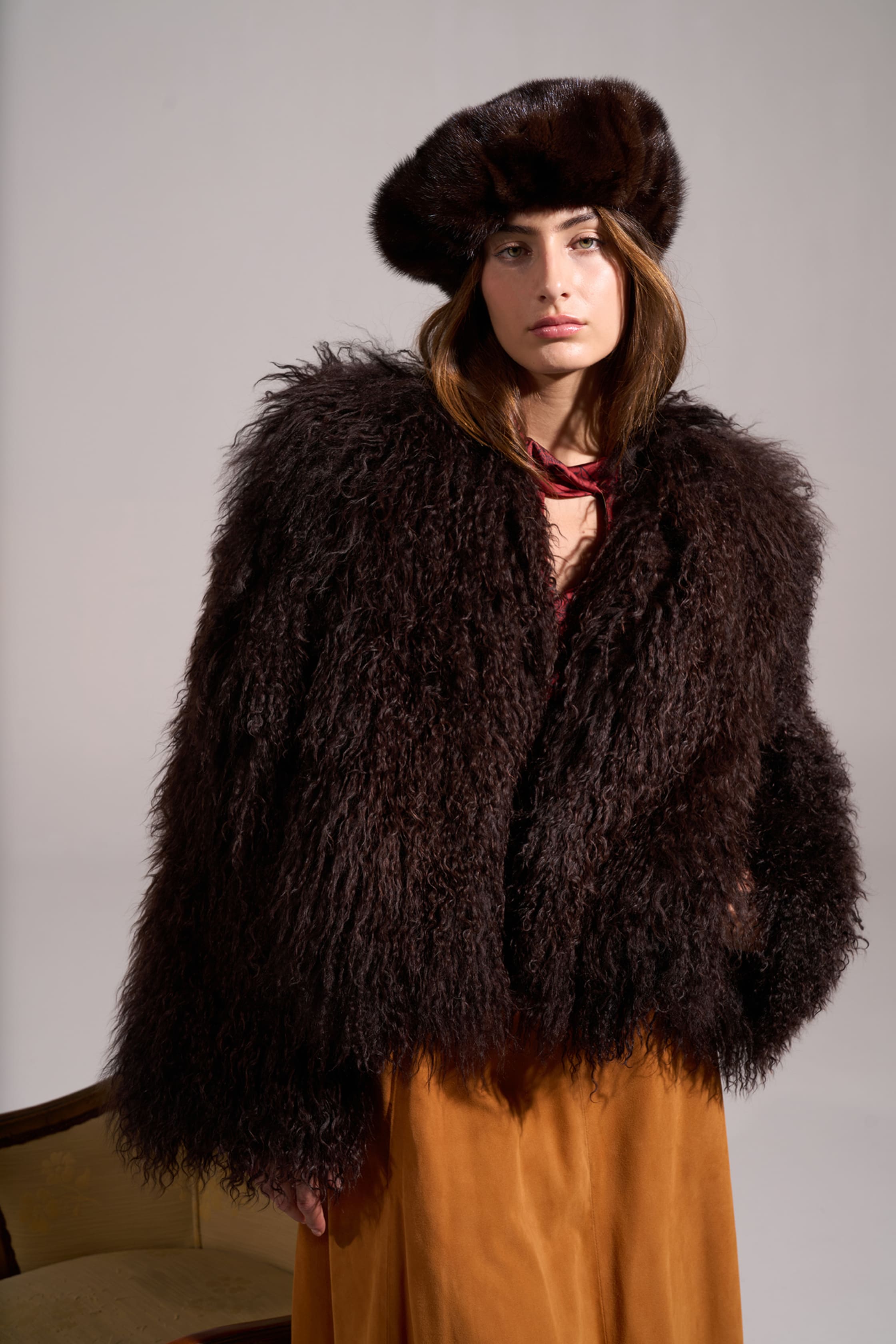 Chaqueta Mongolia Ramiro Guardiola, elaborada artesanalmente con piel de cordero mongol natural. Su textura rizada y ligera aporta volumen y personalidad, manteniendo una estética elegante y contemporánea. Ideal para quienes valoran la calidez, la suavidad y el lujo sostenible.