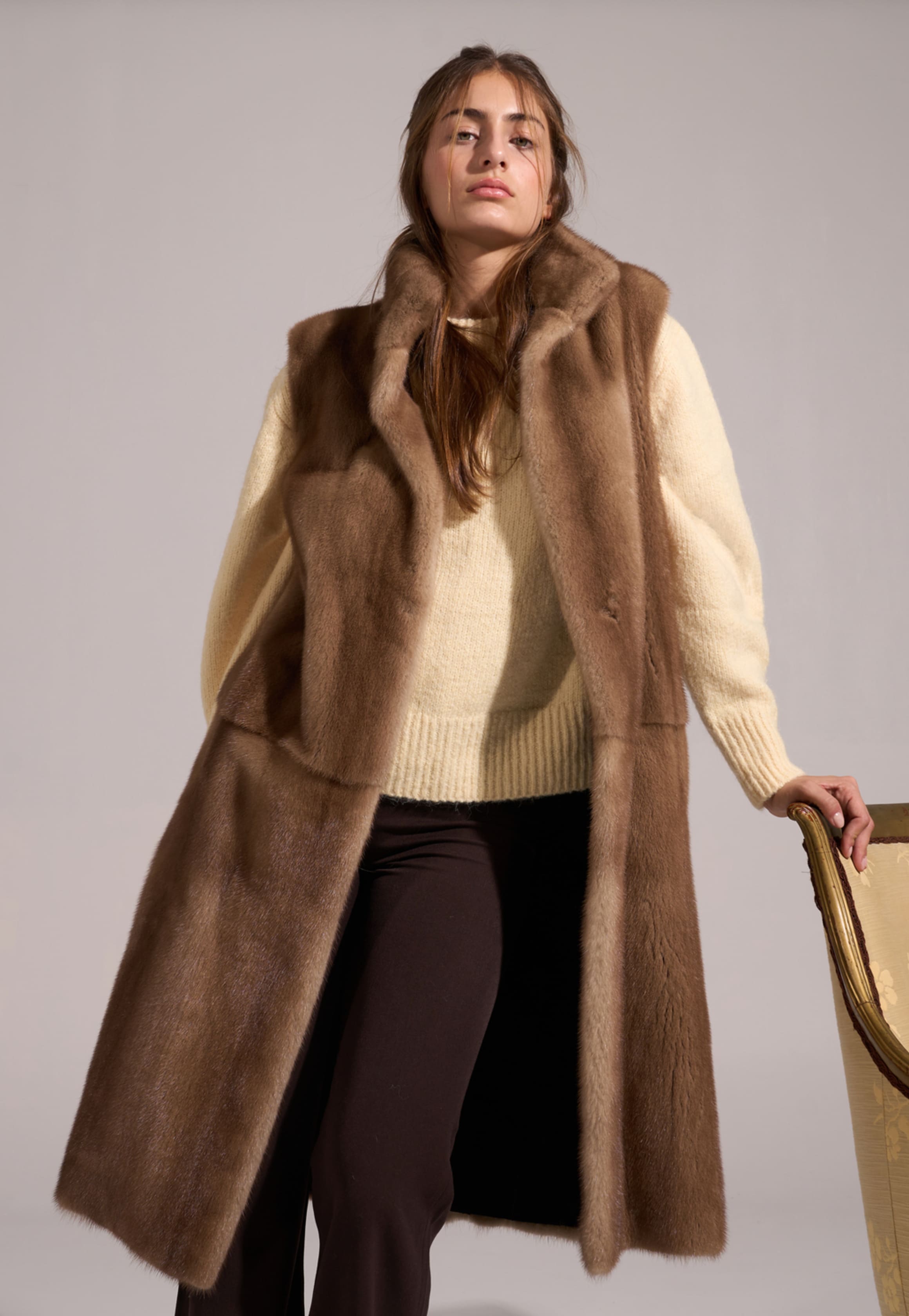 Chaleco Reversible de Visón Ramiro Guardiola, una pieza atemporal elaborada a mano con visón natural de brillo delicado. Su diseño reversible permite adaptarlo a distintos estilos, manteniendo siempre un aire de sofisticación. Disponible bajo pedido, esta prenda combina artesanía, sostenibilidad y exclusividad en una sola creación. ¡Un básico de lujo para los amantes del buen vestir!