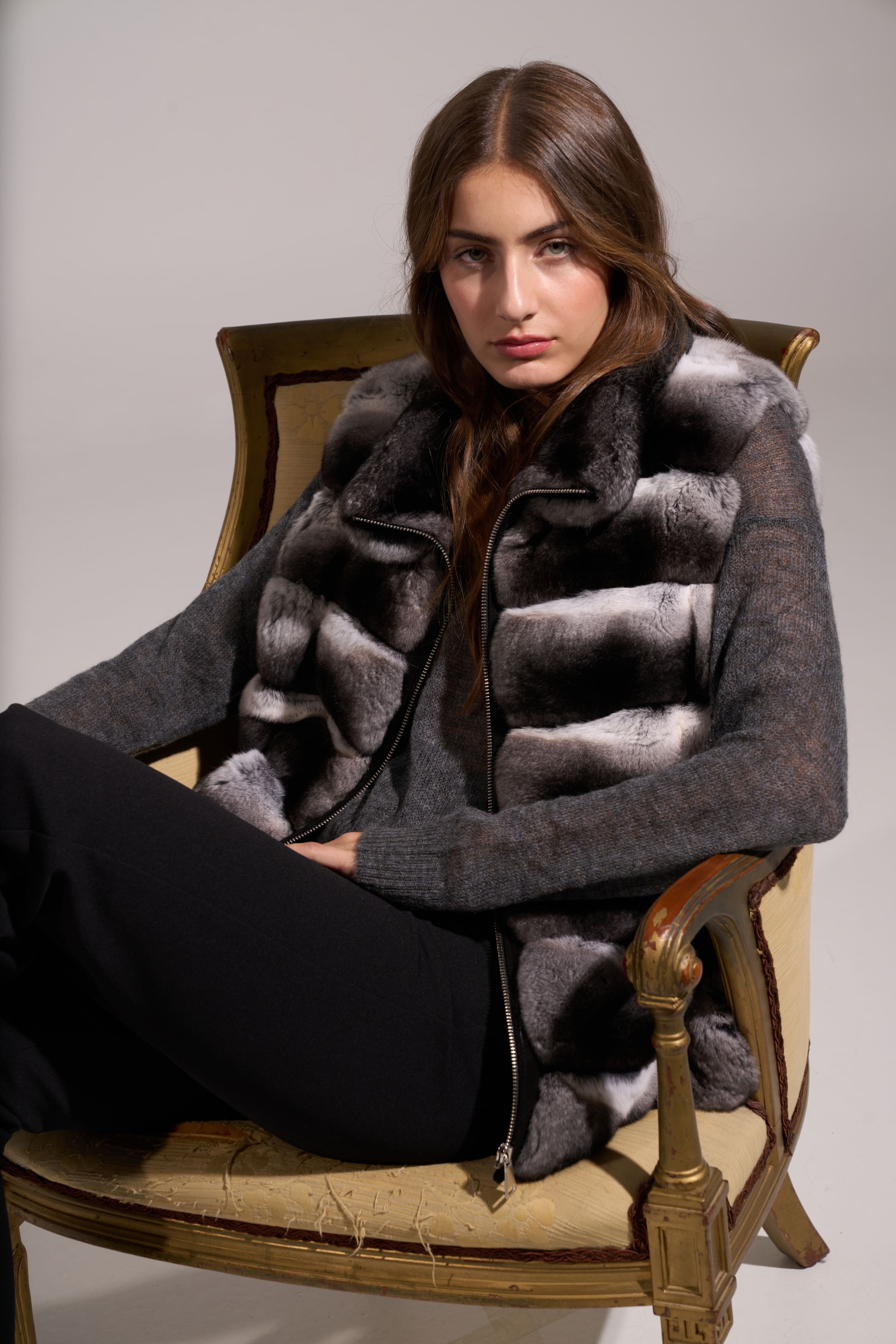 Chaleco de Chinchilla Ramiro Guardiola, elaborado con piel de chinchilla de la más alta calidad. Extremadamente suave, ligero y brillante, representa el máximo lujo artesanal.